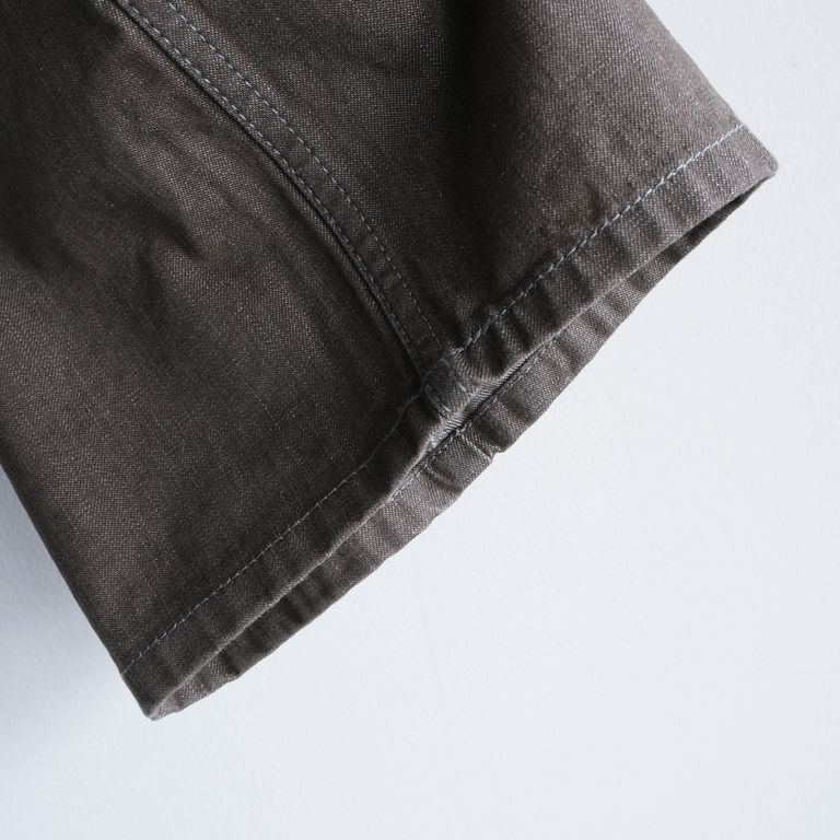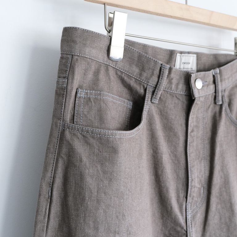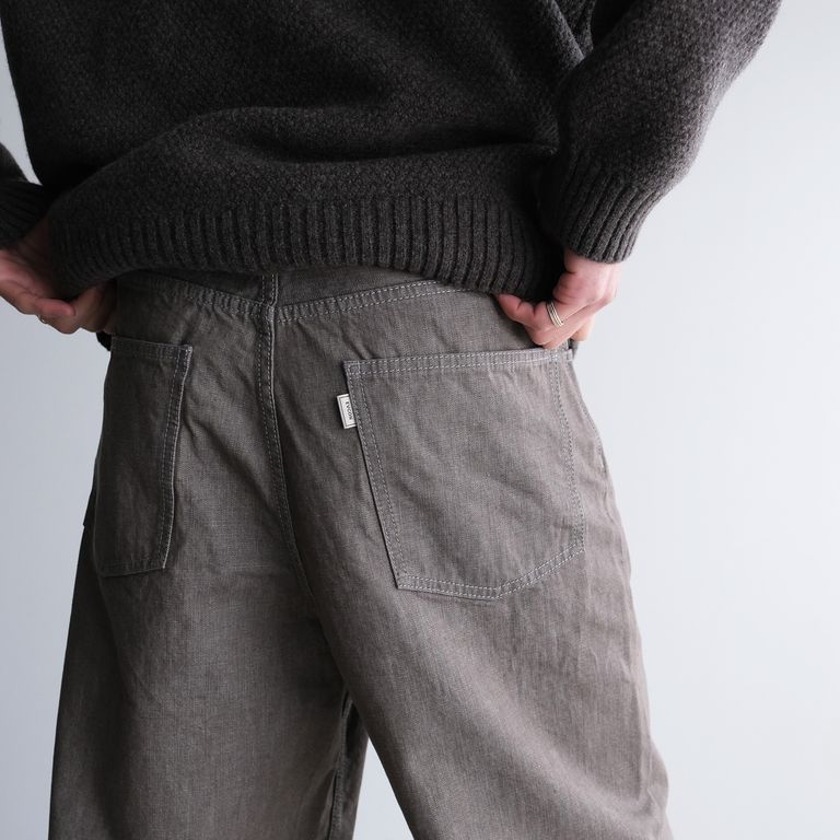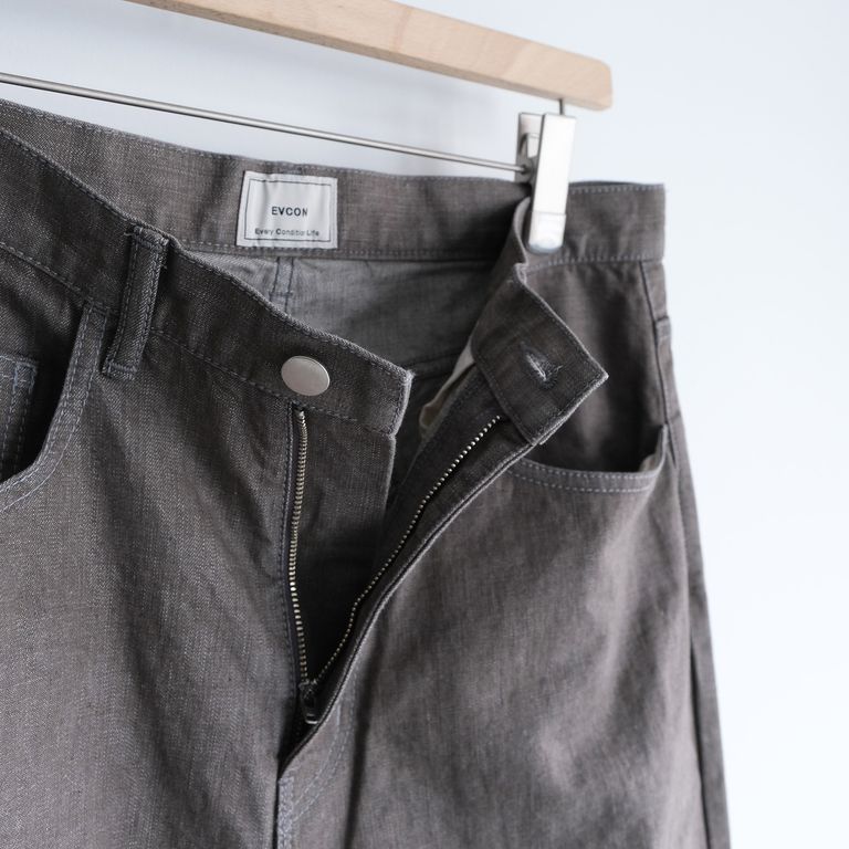 なんといっても特徴的なのは生地の色味。軽快で清涼感のある淡いカラーリングは、国産の10.5ozのムラ糸のライトオンスデニムを使用しており、春夏に着用するにも快適な履き心地です。生地はワンウォッシュ加工を施しています。