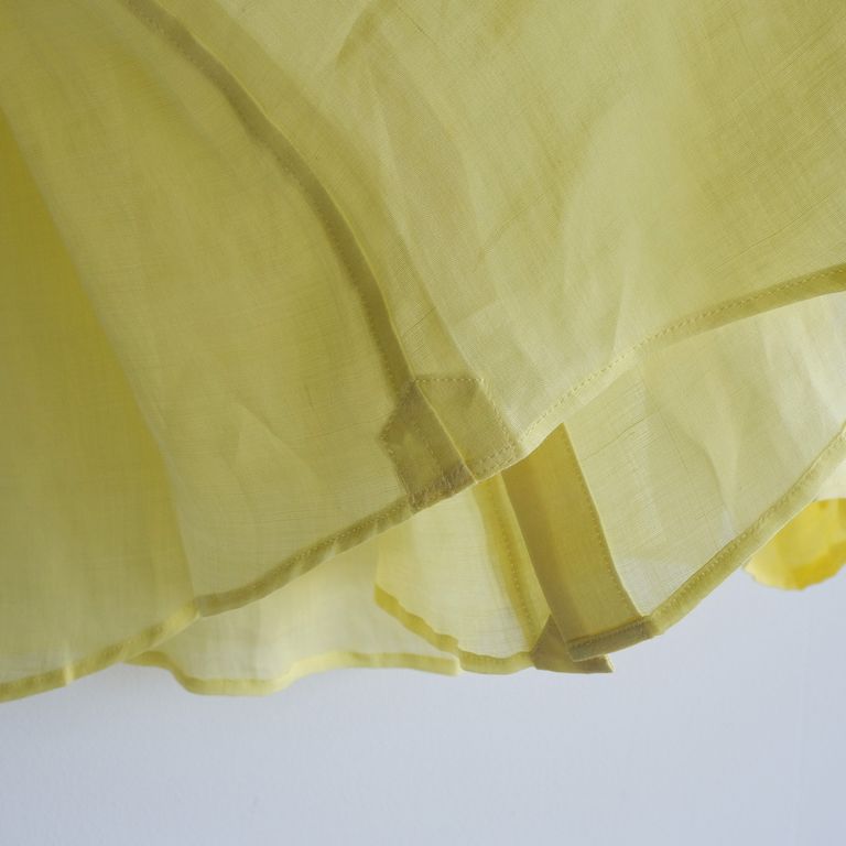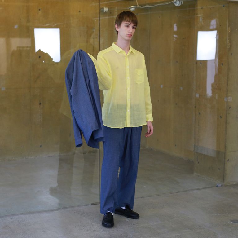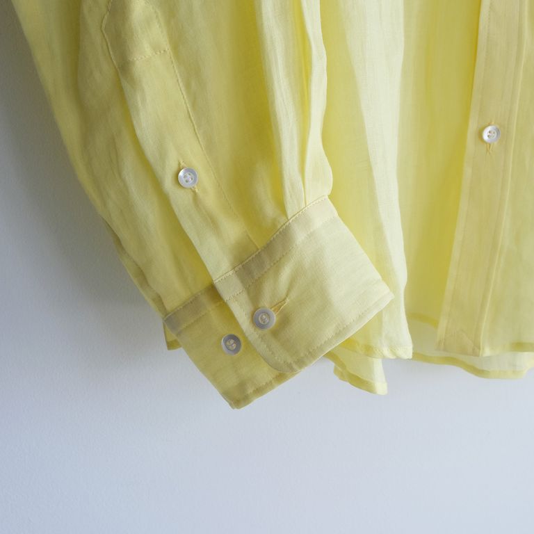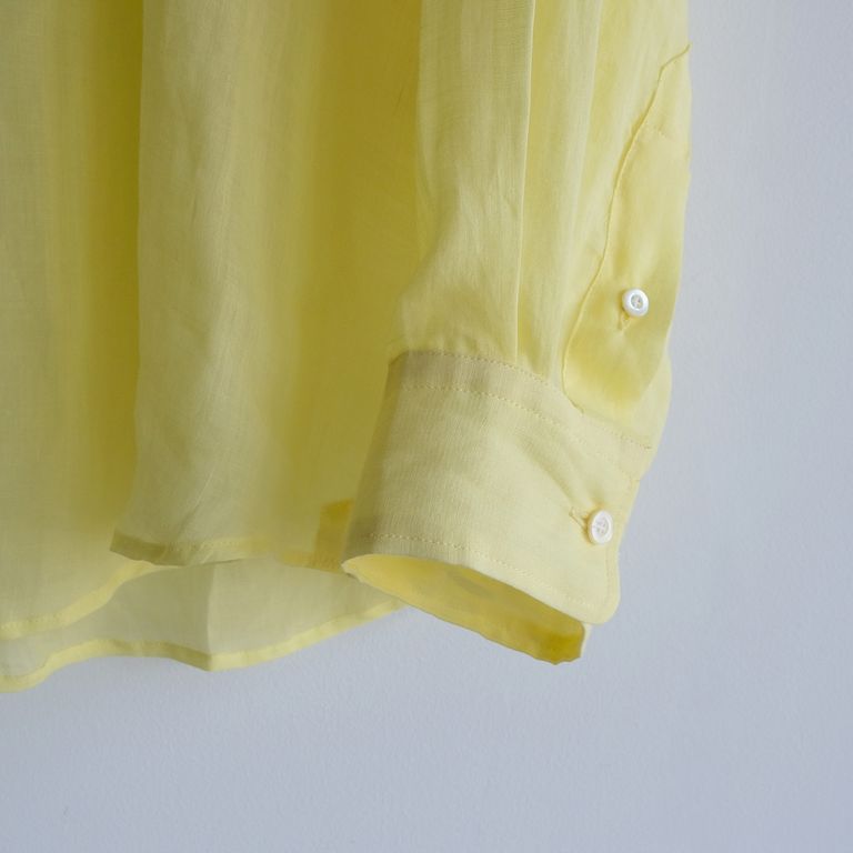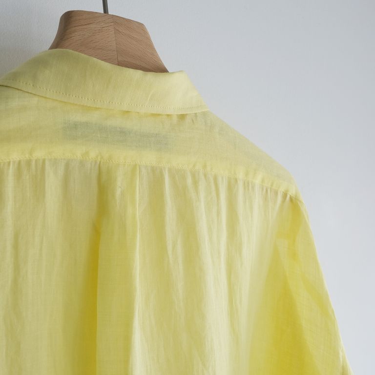 使用されている素材は超極細のラミーローンリネンという薄手で透明感のある平織り生地。リネンらしいシャリ感に加え、ハリやコシのある生地感となっており、薄手でありながらシルエットに程よい膨らみが生まれています。通気性や吸水速乾性に優れているので、暑い真夏の時期でも快適で気持ちよく着用していただけます。